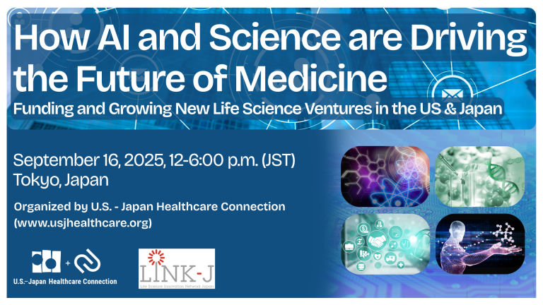 This year’s theme is: How AI and Science are Driving the Future of Medicine: Funding and Growing New Life Science Ventures in the US & Japan. We expect hundreds of attendees from the private, public and academic sectors in Japan. Past attendees have included representatives from companies such as CMIC, Hoya, Kaneka, Mitsubishi Corp., NIPRO, Otsuka, Ricoh, Sumitomo, Takeda, Terumo, UTEC and many more, as well as government agencies including AMED. JETRO, MHLW, METI and others.